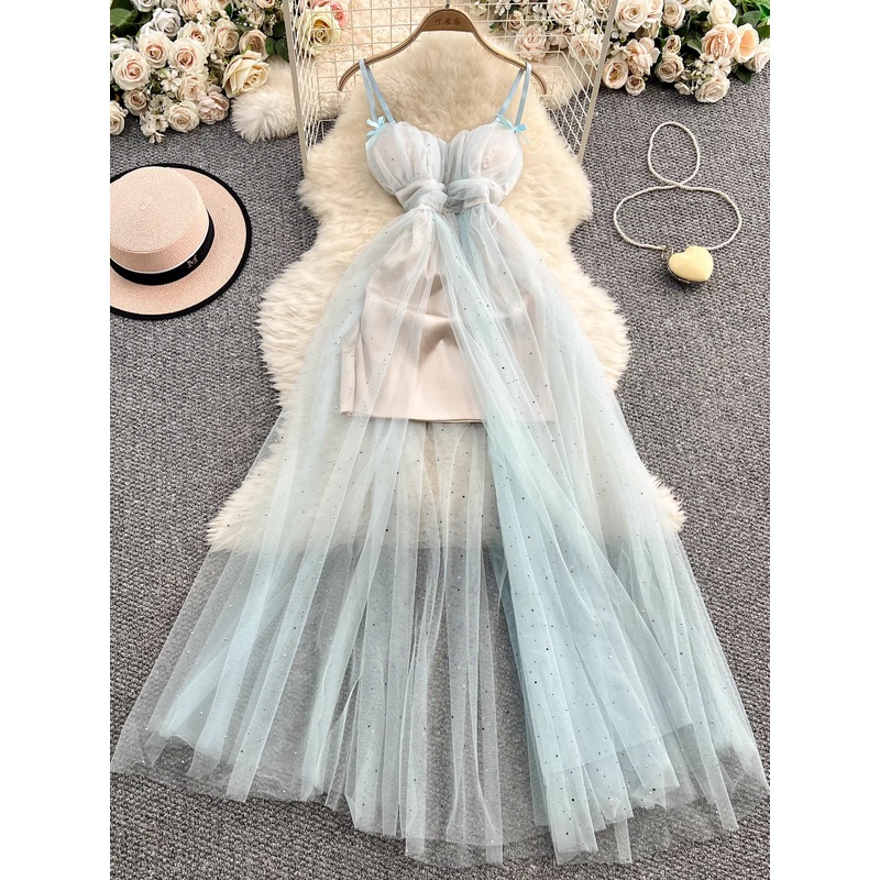 Product No.:L43Waist: High WaistMaterial: MeshSleeves: SleevelessLength: MidiSilhouette: A-LineSizes: M, LColor: Light BlueSize details(cm):M Bust 68-82 Waist 62 Skirt length 140L Bust 72-86 Waist 66 Skirt length 141
