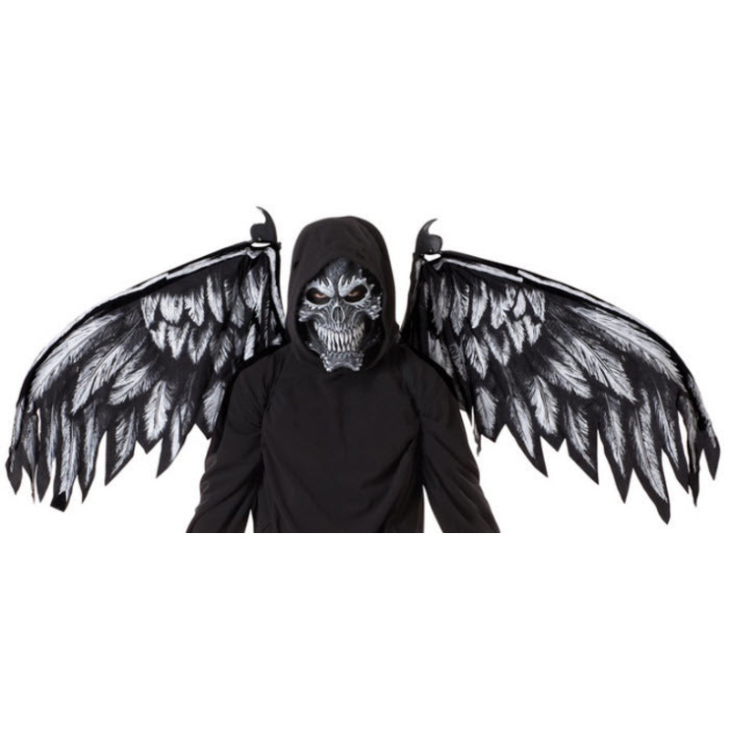 Includes: Movable wings & skull mask. Wings slip on like a backpack & are operated by 2 side cords that can open up the wings up to 6 feet across.