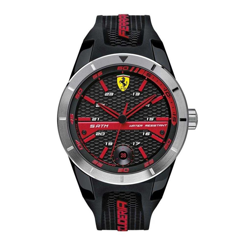 This men's Scuderia Ferrari Redrev T watch is made from stainless steel and resin and is powered by a quartz movement. It is fitted with a black rubber strap and has a black dial. The watch has a date function. Glass Mineral Glass Case Material Stainless S