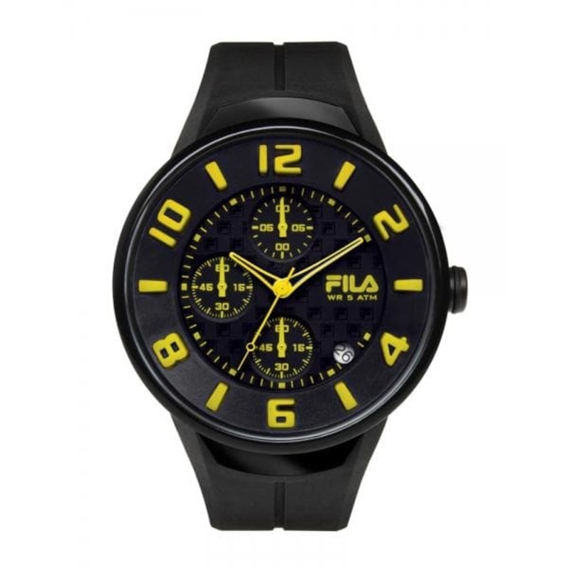 Fila model in a stylish resin case and bracelet. The watch is powered by quartz movement.GlassResinCase MaterialPCCase ColorBlackStrap MaterialRubberStrap ColorBlackMovementQuartzFunction3 Hands, DateLocal Warranty1 YearWater Resistant50mStyleCasualGenderU