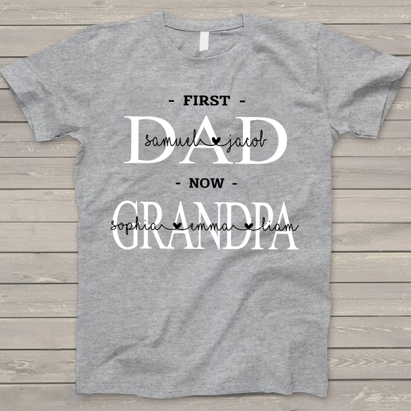 First Dad Now Grandpa Shirt Great as Birthday gifts or Holiday presents. This adorable item can be designed upon anyone's wish with any title.Please enter:1. Nickname. ie. Grandpa, Papa, Poppop, ...etc.2. Kids' Names wanted on the shirt (Names separated by