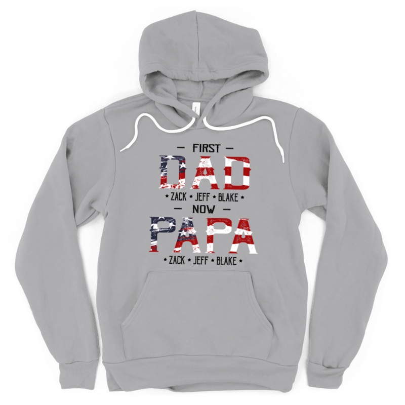 First Dad Now Papa Grandkids FlatThis hoodie is perfect to escape the cold. It covers everything from the hips to the neck, allows the person wearing it to stay toasty at all times. Plus, with the side-front pockets, the phone and the wallet can stay warm,