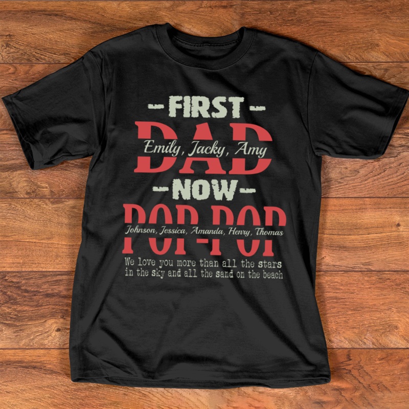 Fist Dad Now Pop Pop GrandkidsGreat as Birthday gifts or Holiday presents. This adorable item can be designed upon anyone's wish with any title.Please enter:1. Nickname: Papa, Grandpa, Pawpaw, Pop-Pop, Papaw ...etc.2. Kids' Names wanted on the shirt (Names