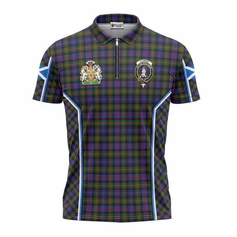 Fleming Tartan Crest Zipper Polo Shirt Scotland Coat of Arm Flag StyleHighlight Made by Materials: Polyester. About this item Embrace the rich heritage of Scottish tartan with this Zipper Polo Shirt, a addition to your wardrobe. The vibrant tartan pattern