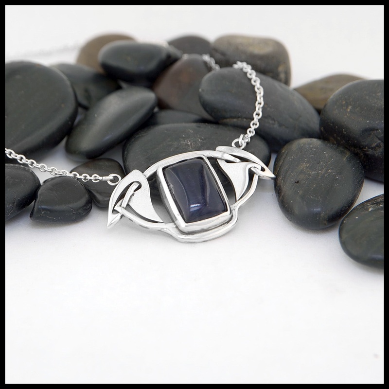 This one of a kind pendant features a Fluorite gemstone set in a custom bezel with a stylized Celtic frame. This Pendant is on an attached 16″ sterling silver cable chain.