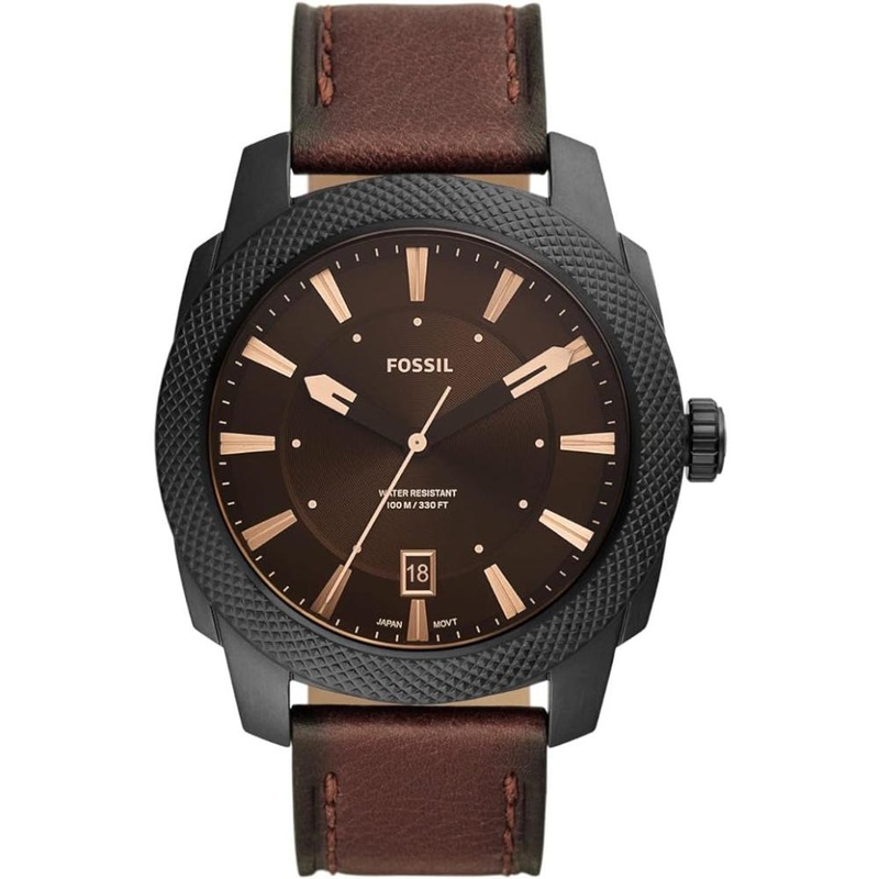 This 49mm Machine features a black sunray textured dial, three-hand date movement and dark brown LiteHide leather strap. Fossil leather products support responsible manufacturing via the Leather Working Group.GlassMineral GlassCase MaterialStainless SteelC