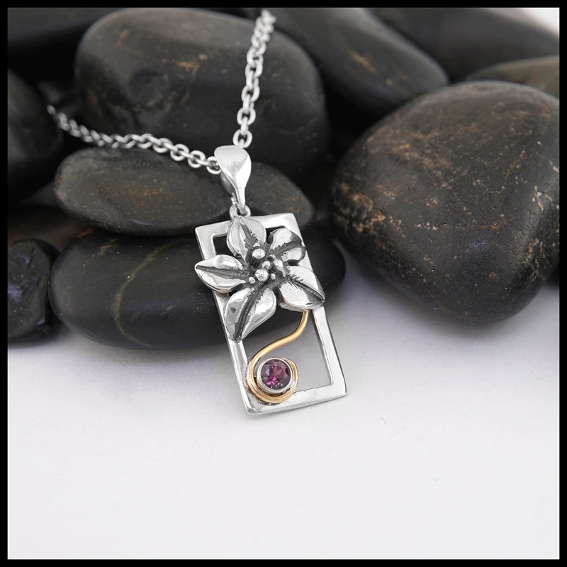 This pendant features a grape garnet bezel set in 14k yellow gold. The stone is set in a custom sterling silver rectangular frame filled with a sterling silver flower and 14k yellow gold wire detail. This pendant comes with an 18″ cable chain.