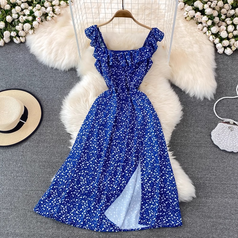 French Retro High Waist Floral Slit Long Skirt Chiffon A Line Dress 1550
