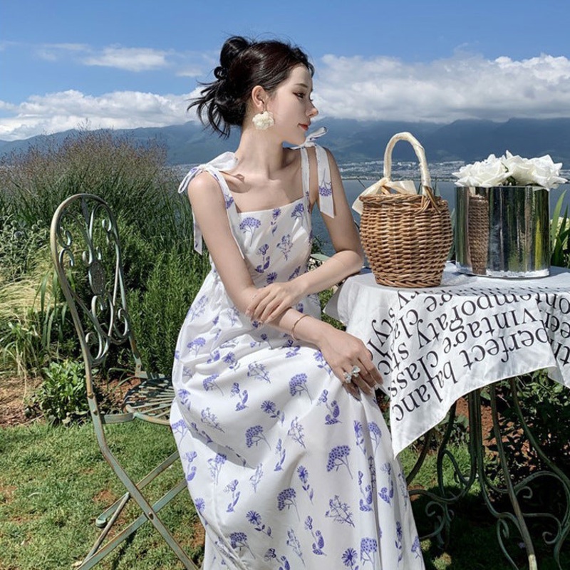 French Retro Thin Strap Long Dress Summer Purple Floral Dress 803