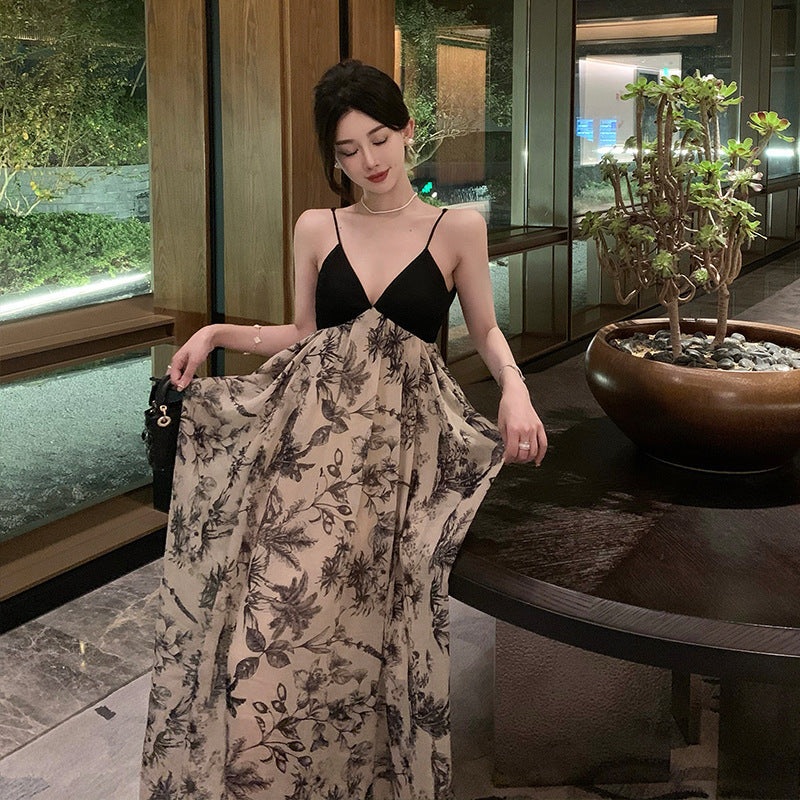 French Retro V-neck Halter Dress Holiday Spaghetti Strap Long Skirt for Women 375