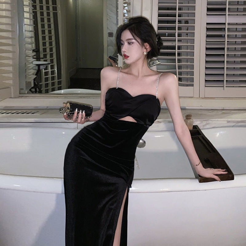 French Sexy Black Dress Backless Spaghetti Straps and Slits 804