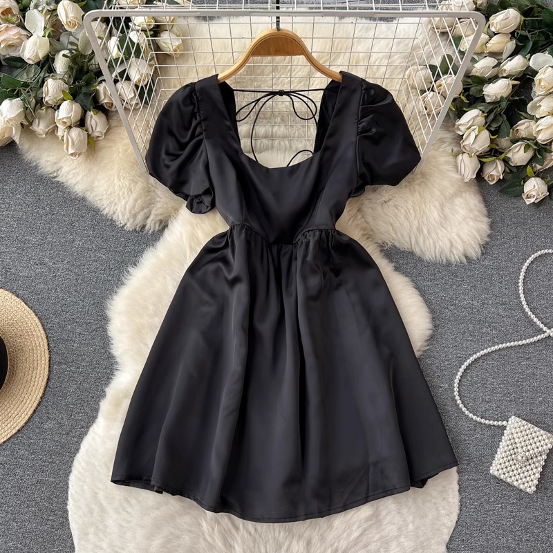 French Style Black Dress Women Summer Backless Puff Sleeve Skirt 1175