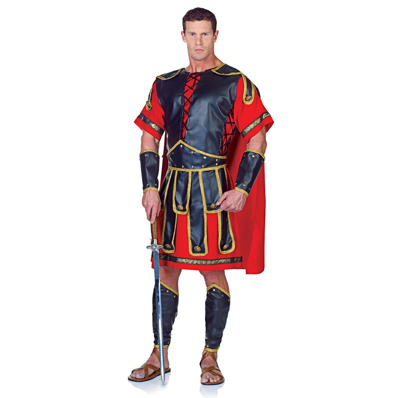 Includes: Red Tunic, faux leather belt with attached straps, faux leather laced chest guard with attached matching cape, leg & arm guards.Color: Black/Red (shown)Size: (Chest/Waist)O/S: (C: up to 49" / W: up to 46"), 2XLDeluxe / Good QualityUW29432