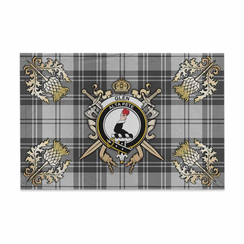 Glen Tartan House Flag with Family Crest and Golden Thistle Crossed Sword Design