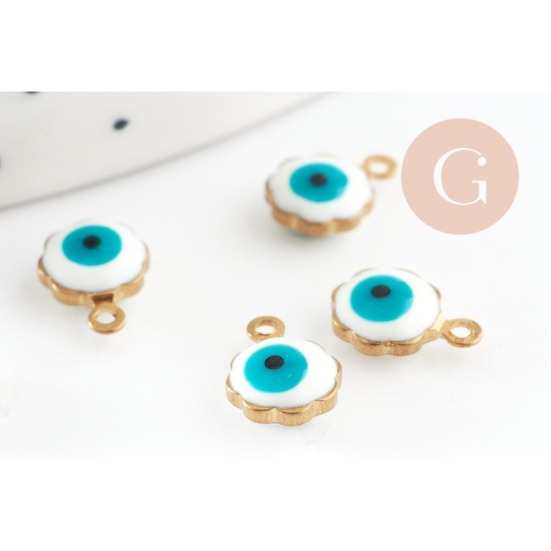 Golden pendants White enamel flower, evil eye, creative supplies, golden brass, lucky pendant, jewelry creation, 9mm, set of 10 A set of 10 brass pendants with an eye motif in white and blue enamel Length: 9mm Diameter: 7mm Thickness: 5mm Hole 1mm Other br