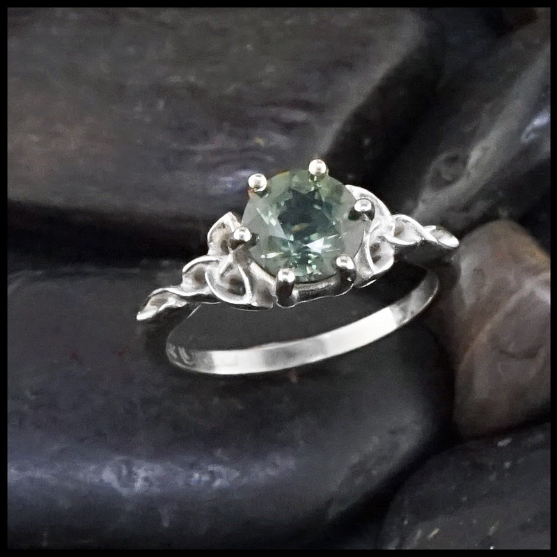 Stunning 14K White Gold ring with Trinity Knot details set on either side of a 2.08CT Green Sapphire. This ring is a 7 1/4 but can be sized upon request.
