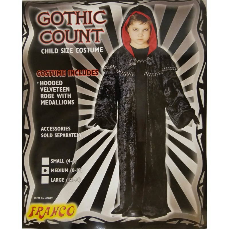 Franco Novelties Co. Gothic Count CostumeIncludes: Hooded Velveteen Robe with MedallionsSize: Child Medium (8-10)Color: As shownFRA48049