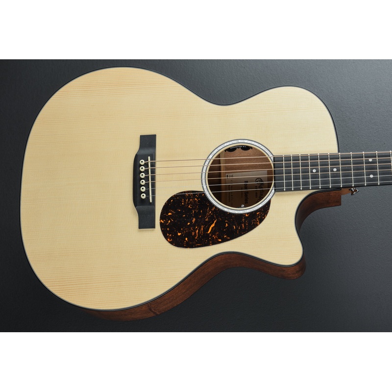 From Martin:"With a gorgeous glossed spruce top and sapele back and sides, this solid wood Grand Performance model with cutaway is a great sounding guitar at an affordable price. New to this model are stunning mother-of-pearl pattern fingerboard and rosett