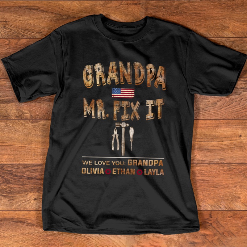Grandpa Mr fix it GrandkidsGreat as Birthday gifts or Holiday presents. This adorable item can be designed upon anyone's wish with any title.Please enter:1. Nickname: Papa, Grandpa, Pawpaw, Pop-Pop, Papaw ...etc.2. Kids' Names wanted on the shirt (Names se
