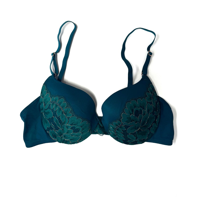 Brand new - donated from the designerEmerald green wired push up bra with smooth padded cups, green and gold floral lace on the outside, adjustable straps, and a double clasp closureSize 34B79% polyamide and 21% elastaneEstimated Original Retail Price: $48