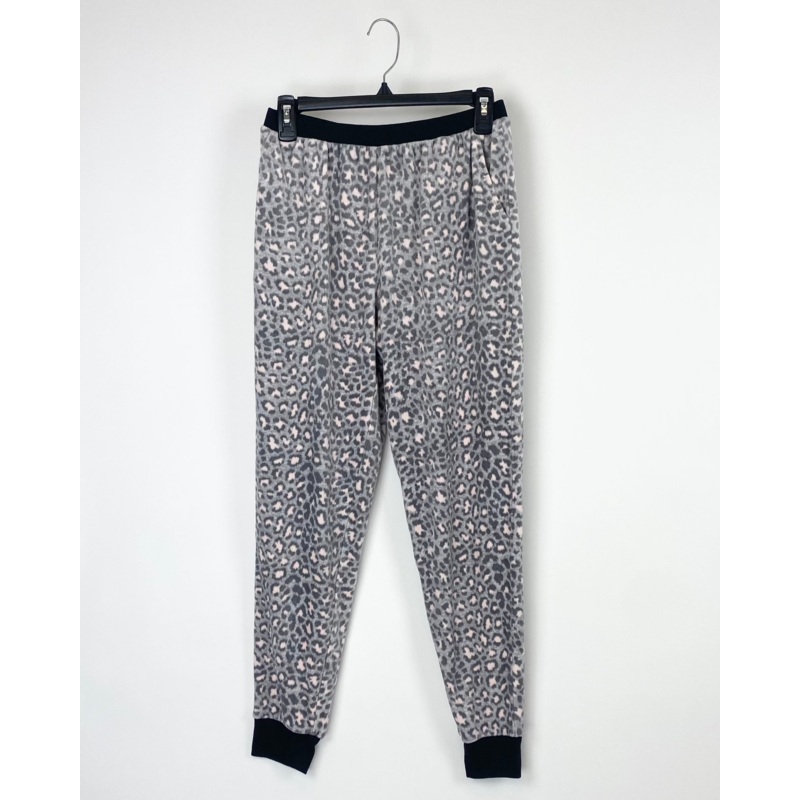 Kate Spade fleece grey and pink cheetah print pajama pants with elastic stretch waistband, pockets and tapered leg