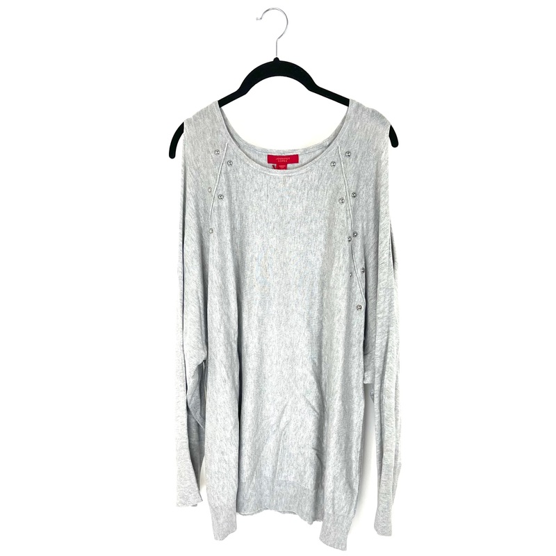 Brand new - donated from the designerJennifer Lopez grey cold shoulder knit sweater with crew neckline, long sleeve, silver stud accents along front, soft and stretchy material1X (Size 14/16)Estimated Original Retail Price: $54Fabric Contents: 78% Viscose