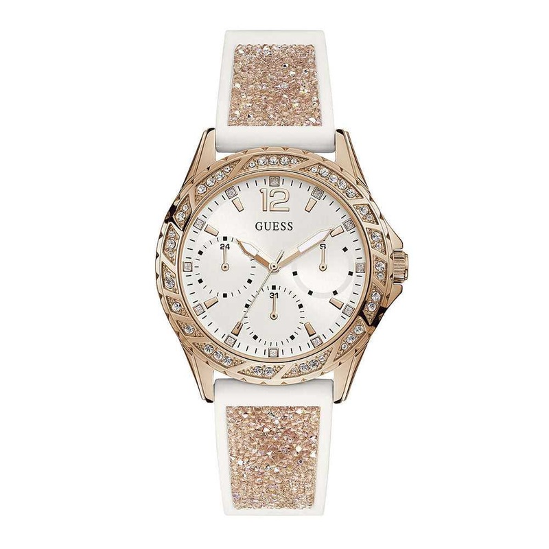 Spruce up your style with this beautiful couple's Guess watch, suitable for formal occasions and daily wear. Glass Mineral Glass Case Material Stainless Steel Case Color gold Strap Material silicone Movement Quartz Function Multifunction Local Warranty 1 Y