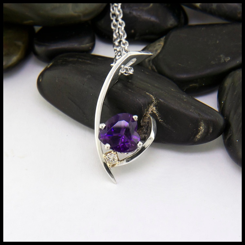 This sterling silver pendant features a heart-shaped amethyst centerpiece and a dazzling princess cut diamond accent set in 14K yellow gold. It also includes an 18" cable chain. Show your love with this elegant, classic piece.Original design Tom CarterPlea