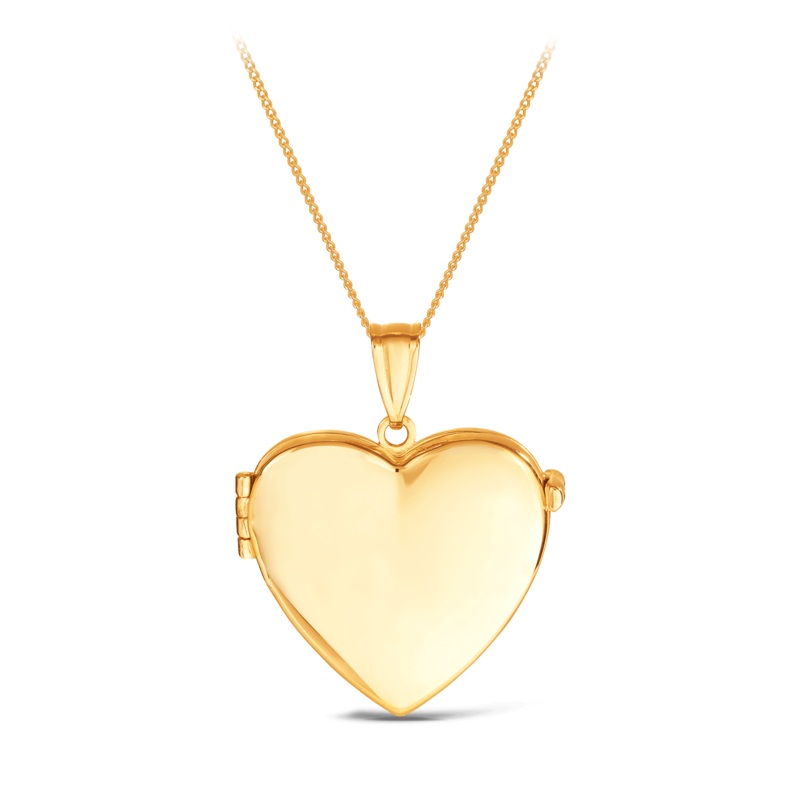 A classic, timeless plain design, this heart-shaped locket pendant is a treasure that allows you to store a meaningful photo. It’s made in shiny, polished 9ct yellow gold and comes with a sterling silver, gold plated chain. The plain design allows you to add engraving.