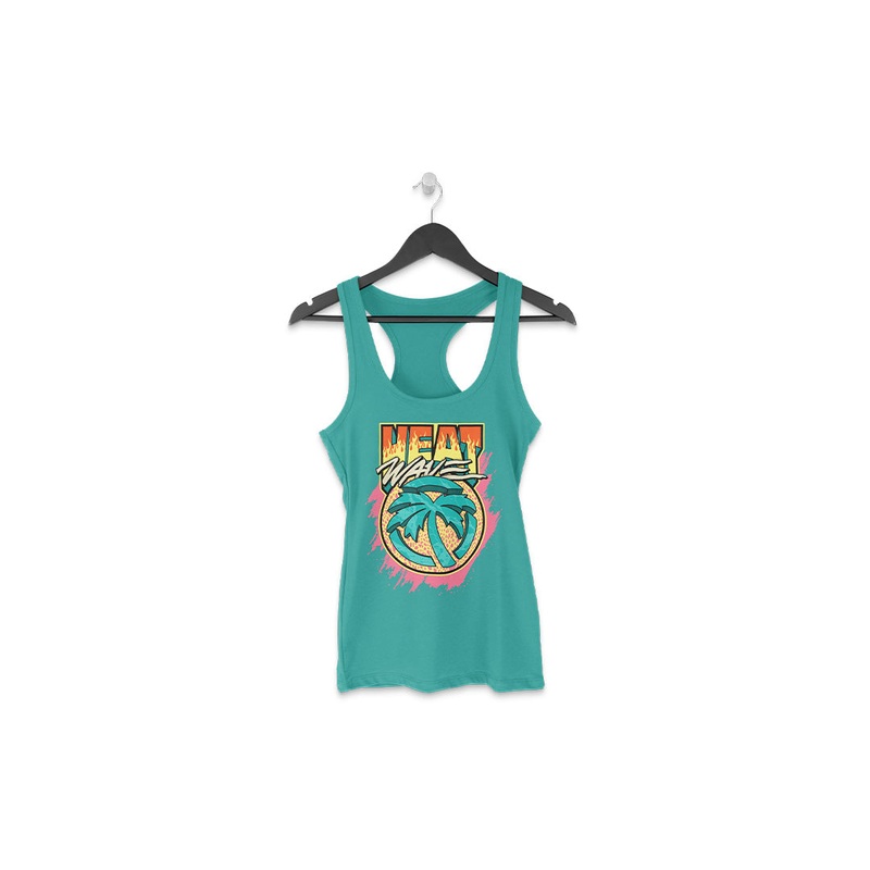 Our ladies racer back tanks are always a hit, and are back and even better than ever for 2025. We turned up the intensity to 100 with this piping hot graphic for summer 2025. This features a combination of patterns and colors and that palm tree ICON we all