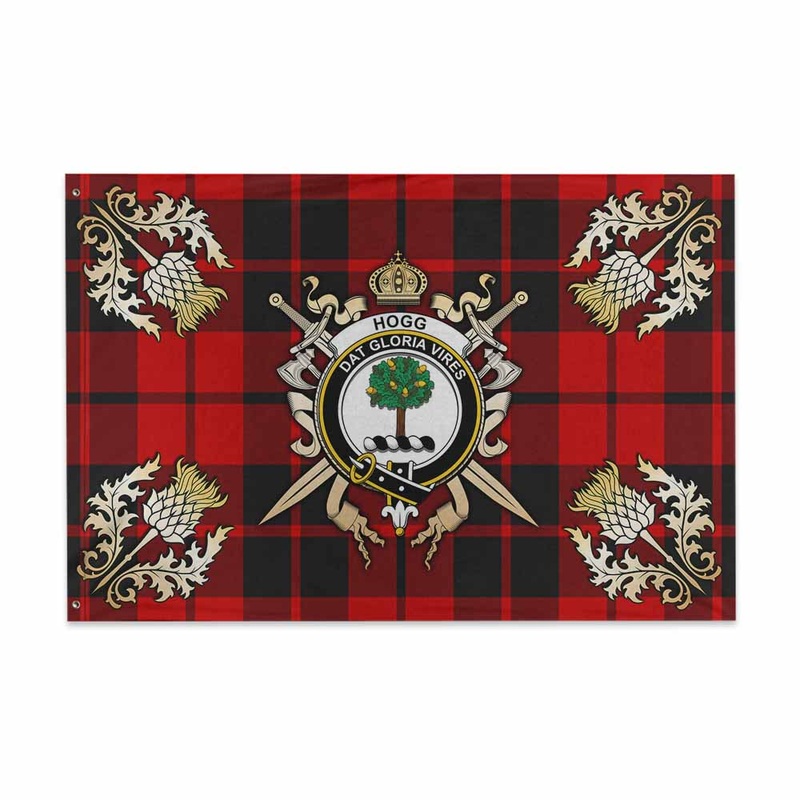Hogg (Hog) Tartan House Flag with Family Crest and Golden Thistle Crossed Sword Design