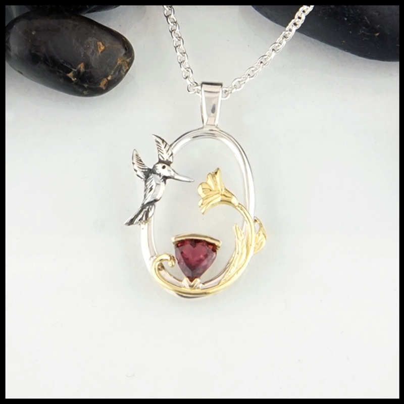 This pendant is sterling silver with 14K Yellow gold accents and features a trillion raspberry tourmaline. This pendant comes with an 18" sterling silvercable chain.Original designs Stephen WalkerPrices subject to change.Please call or email for more infor