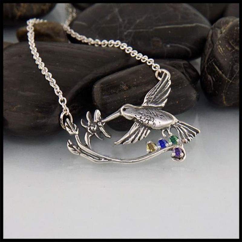 Hummingbird and flower pendant in Sterling Silver with an attached 16″ Cable Chain, making the total pendant length approximately 17″. Available with 1-7 simulated birthstones. Please note 1 stone is set below the hummingbird, and the rest will be set above the branch.