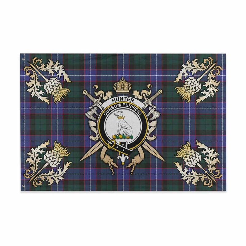 Hunter (Hunterston) Tartan House Flag with Family Crest and Golden Thistle Crossed Sword Design