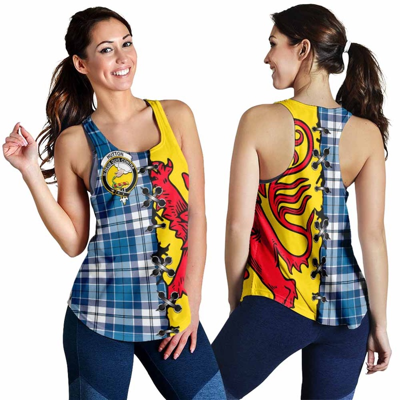 Hutton Tartan Family Crest Women Racerback Tanks Lion Rampant Honor