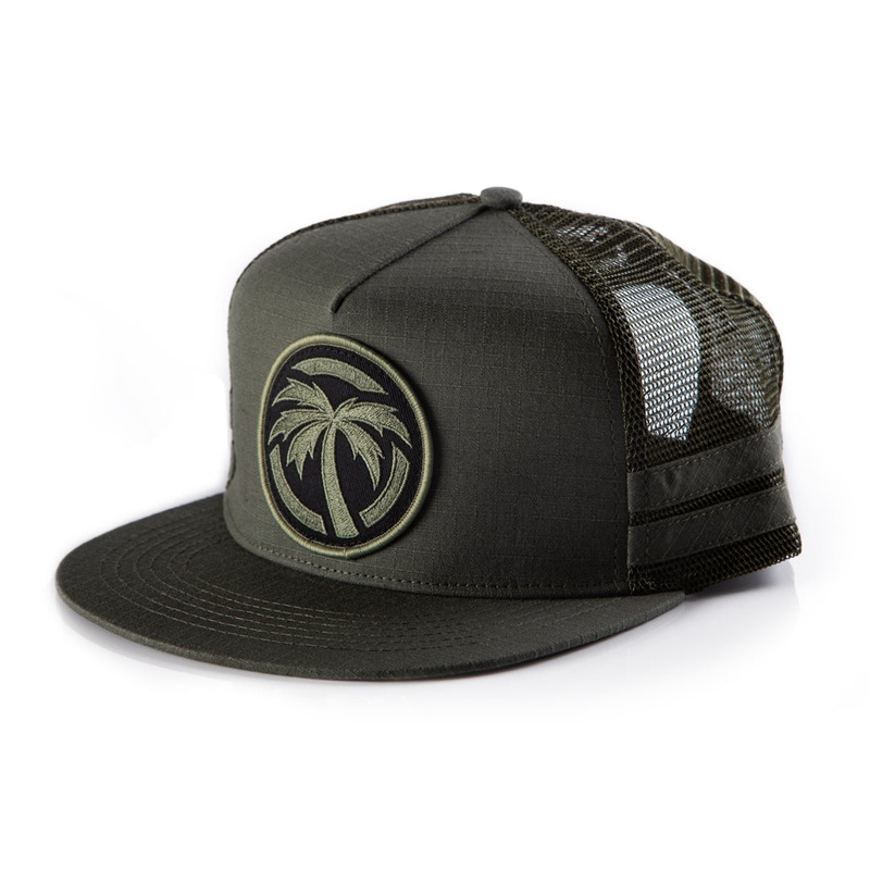 The SOCOM hat features the Palm Tree ICON logo embroidered dead center on the rip-stop OD Green 5 panel crown, and a Heat Wave spell out over the keyhole on the back. Tonal stripes on the side.