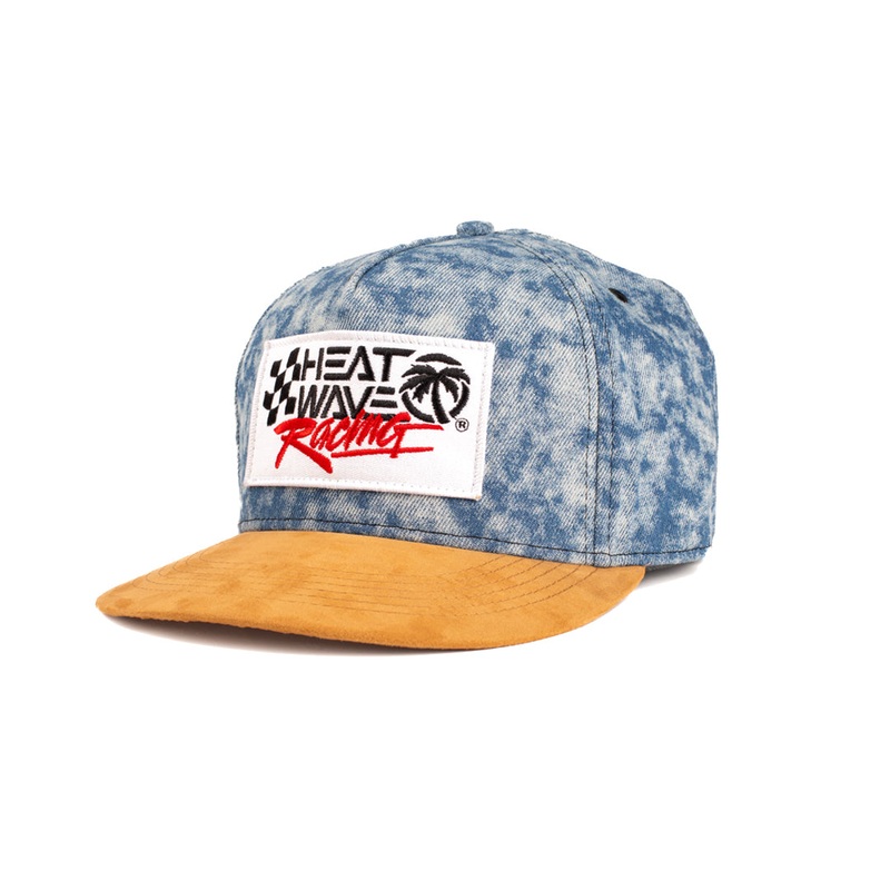 This hat mashes up the best of the best in the dad world. Funky acid wash denim, suede and racing. The Wrangler Racing hat feature an acid wash crown, paired up with a smooth tan suede bill. On the center of the crown you get our classic Heat Wave Racing p