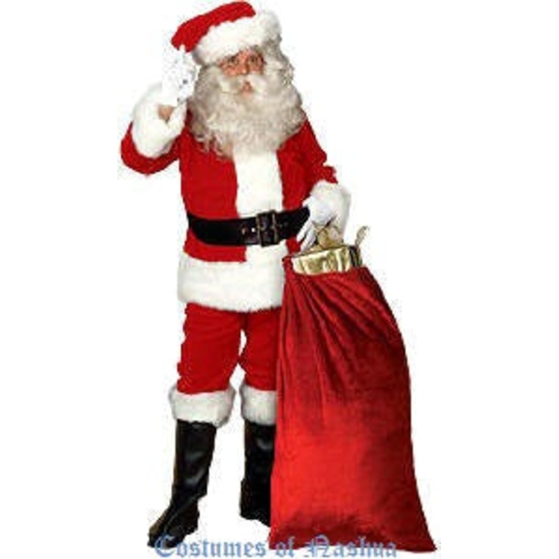 R2392Includes: Bright red Lux-Seal Santa suittrimmed in thick white fox-like fur fabric,zipper front closure, hat, pants,belt w/5" buckle & fur trimmed boot tops.Size: Std (Chest 42-48)To ensure proper fit, please include chest, waist & girth measurements