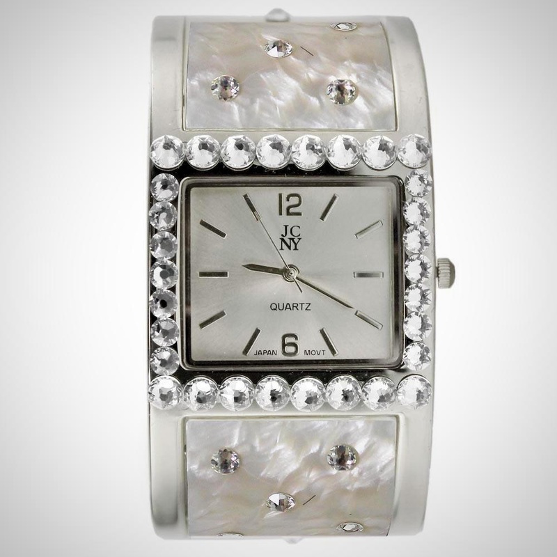 Elegant gold-tone watch featuring sparkling crystals accents on both the bezel & bangle Embellished with crystals, which are set by Jimmy Crystal's expert craftsmanship. This product provides unparalleled aesthetics to transcend elegance. Mother-of-pea