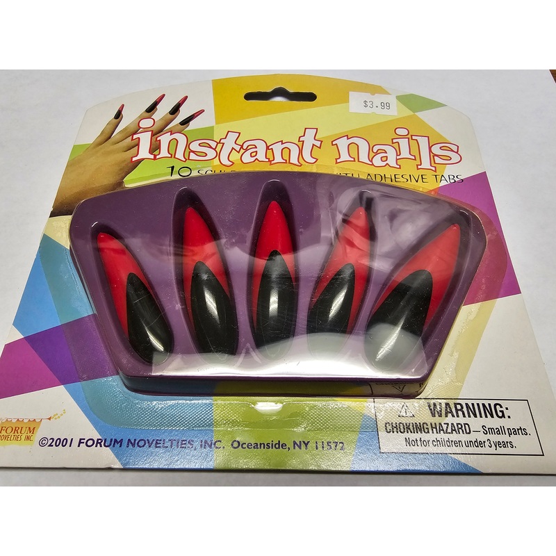 Forum Novelties Instant NailsNo Glue Required!Includes: 10 sculptured nails with adhesive tabsSafe-Sized for easy fit-ReusableRecommended for ages 8 and upF54670 (Red/Black) F54671 (Red/Gold)
