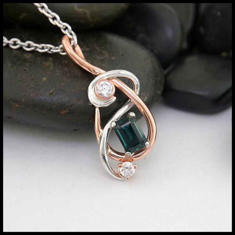 An interlocking sterling silver and 14K rose gold frame hold an emerald cut blue tourmaline and two diamonds. This pendant comes with an 18" cable chain.Original design Tom CarterPlease call or email for more information800.488.6347orservice@walkermetalsmi
