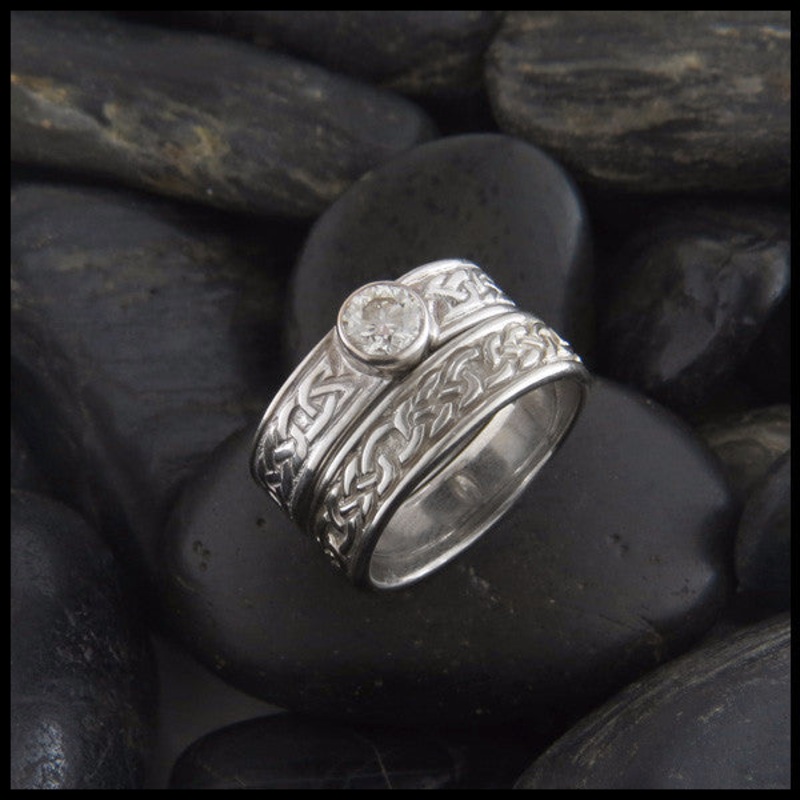The Josephine’s knot is a traditional lover’s knot. The strands intertwine continuously around the band to symbolize eternal love.
