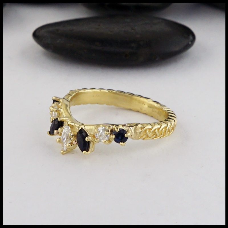 18K yellow gold band with Josephine's Knot detailing on the band set with three diamonds and four sapphires.This ring is a size 6 1/4 and cannot be resized.Original designs Steve WalkerPlease call or email for more information800.488.6347orservice@walkerme