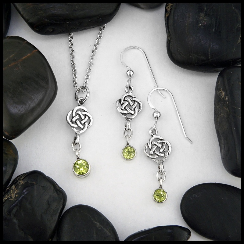 Sterling Silver Josephine's Knot pendant set with a5mmPeridot stone. Silver drop earrings are set with a 4mm Peridot. The pendant comes with an 18" silver cable chain.Original designs Stephen WalkerPlease call or email for more information800.488.6347orser