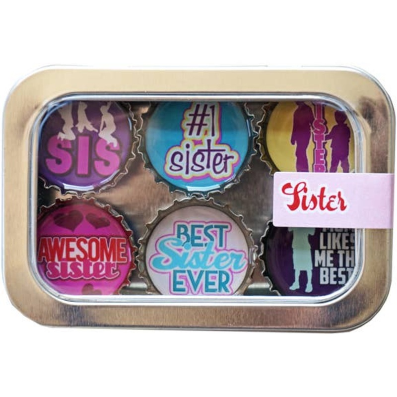 Six-pack set of Sister themed magnets, made in the USA from recycled bottle caps. Our magnetic expressions make fabulous and unique gifts and can be used in the kitchen, office or on any magnetic surface. Each magnet set comes in the display tin (just like in the picture) and the magnets are strong enough to hold the entire tin on a magnetic surface for display.