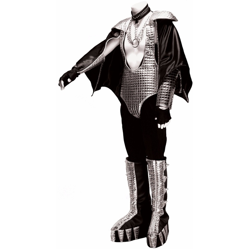 Includes: Black stretch jumpsuit, front tie satin cape with silver trim and loops to fit around fingers, silver quilted poly-foam chest and shoulder piece with attached chains and studded choker collar, silver quilted poly-foam arm bands, poly foam padded vinyl boot covers with silver accents designed to look like platform boots.