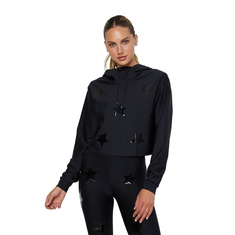 Our Lux Essential Star Knockout Lynx hoodieis one of our best selling styles and is a definite KNOCKOUT! This celebrity-favorite hoodie with black patent bonded star details. With a loose fit this is made of high-stretch, skin like compressive fabric. Wear it and be a total knockout at the gym or where ever your day takes you.