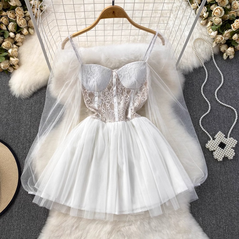 Korean Style Sexy Long Sleeves Square Collar Mesh A Line Fluffy Princess Dress Summer 1492