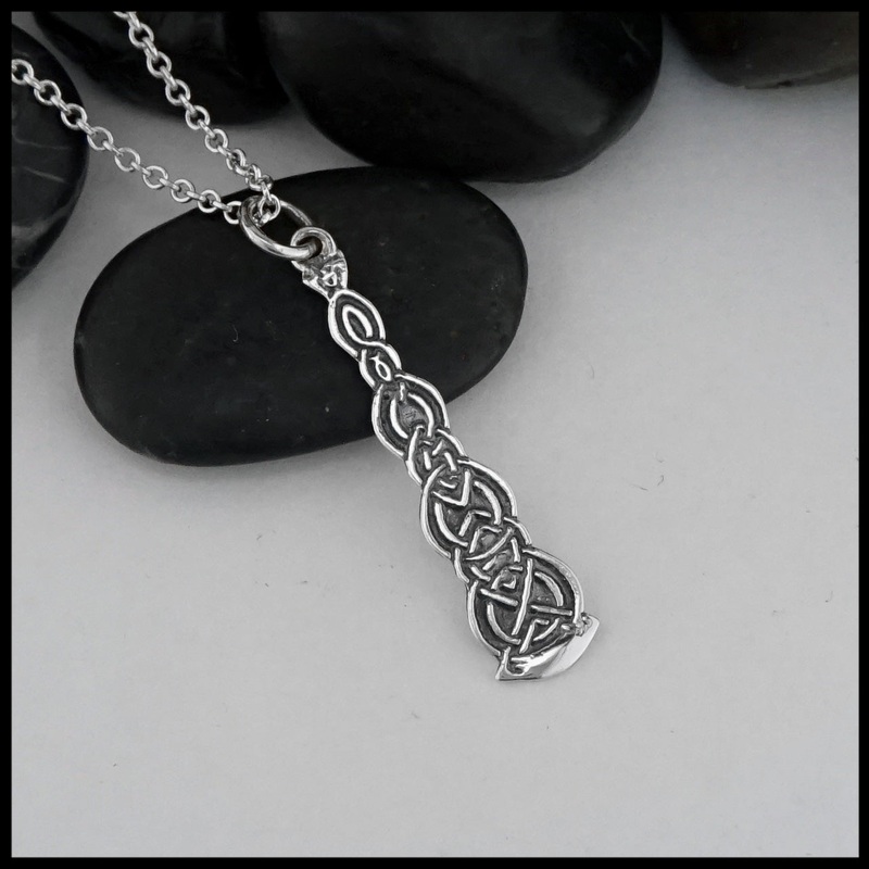 Sterling Silverpendant with elongated knotwork designs. Pendant is available with your choice of chain. Pictured on an 18″ Cable Chain.