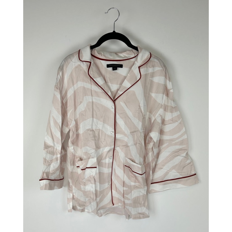 Brand new - donated from the designerDonna Karan New York light pink and white abstract print pajama set with button-down long sleeve shirt that has front pockets and collar, and pants that have an elastic waistband, pockets, and drawstring.Small (Size 4-6